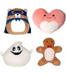 95% polyester/5% elastane. Soft plush toys - white ghost, blue hero bear, light brown gingerbread man and pink heart. Embroidered facial features. White front panel. Height ranges from 23cm up to 25cm. Suitable for vinyl print and sublimation.